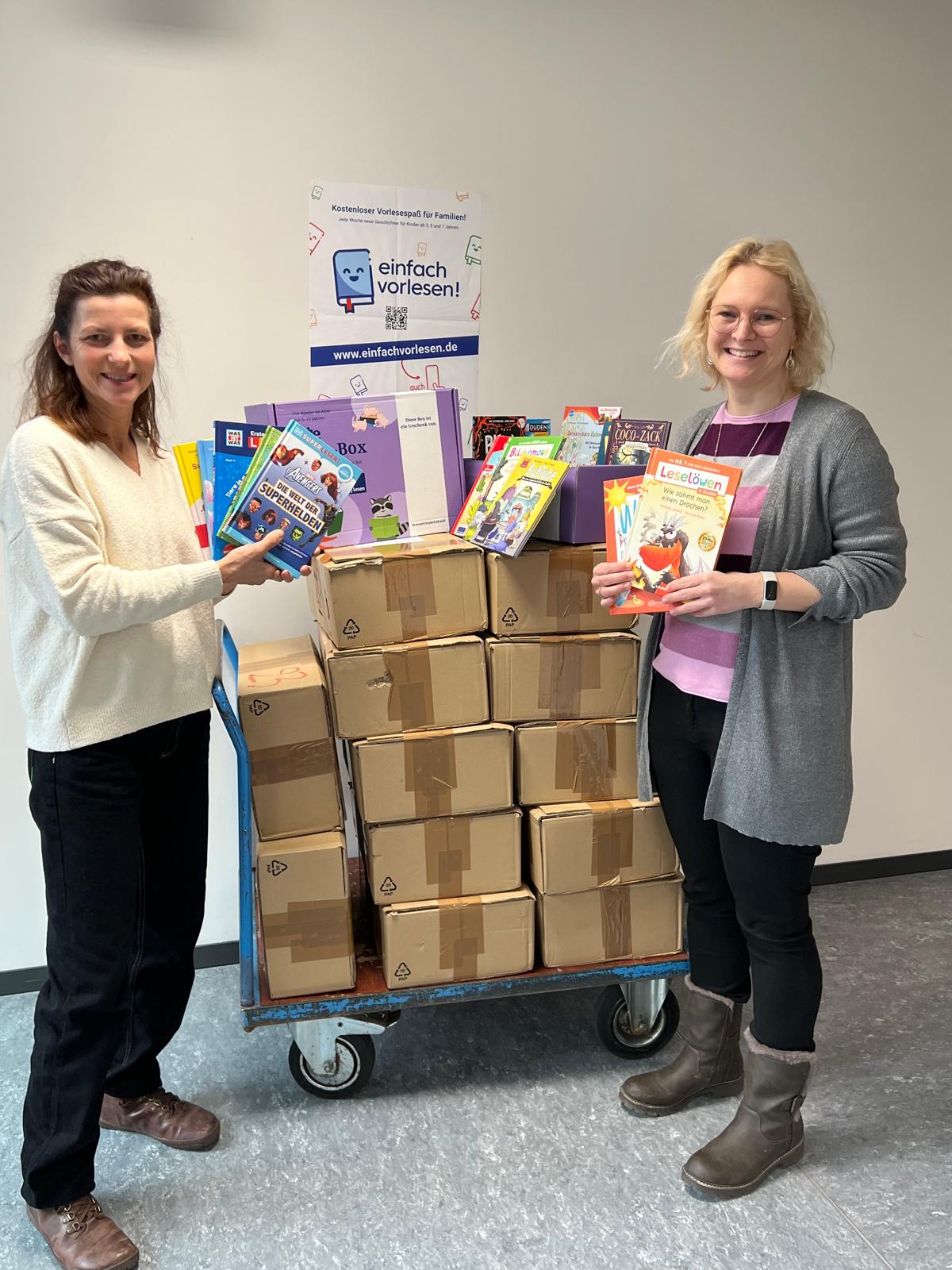 Leider gab es dieses Jahr Lieferprobleme, sodass die Bücher erst nach dem offiziellem Vorlesetag verteilt werden konnten. Frau Strom-Haensch und Frau Dr. Schilling freuten sich dennoch über die tollen Buchgeschenke, denn Vorlesen ist ein fester Bestandteil im Kita- und Schulalltag, sodass die Bücher auch später noch gut genutzt werden können.