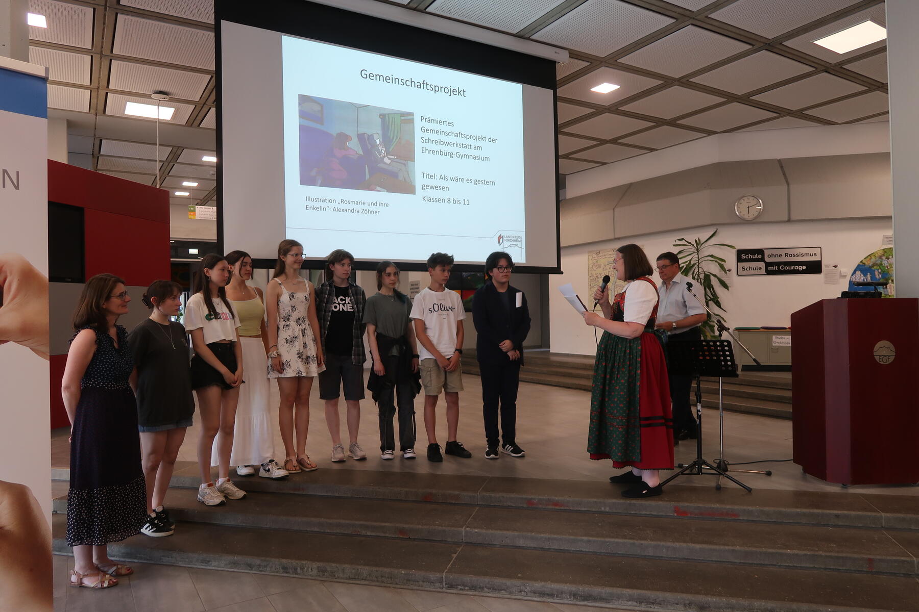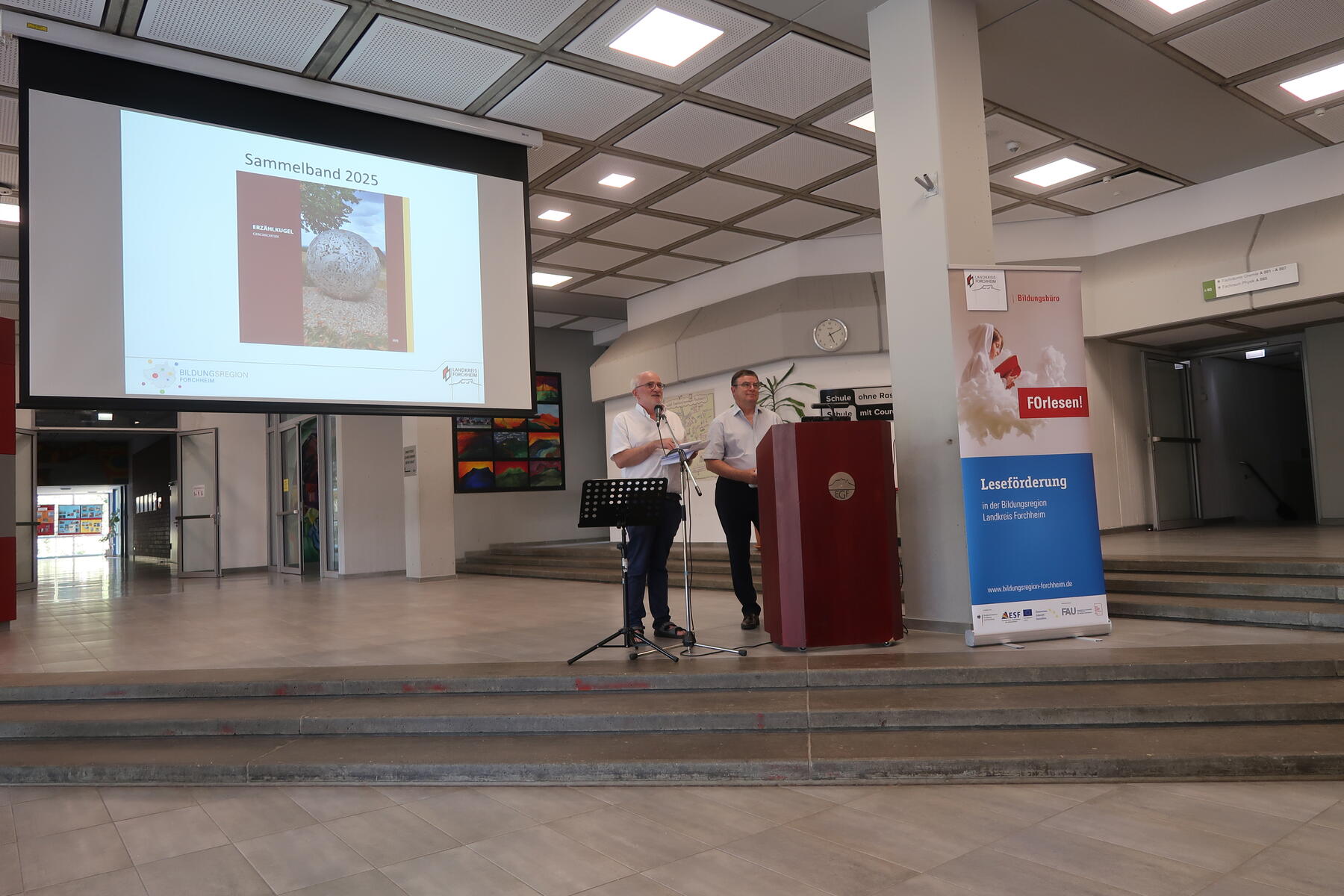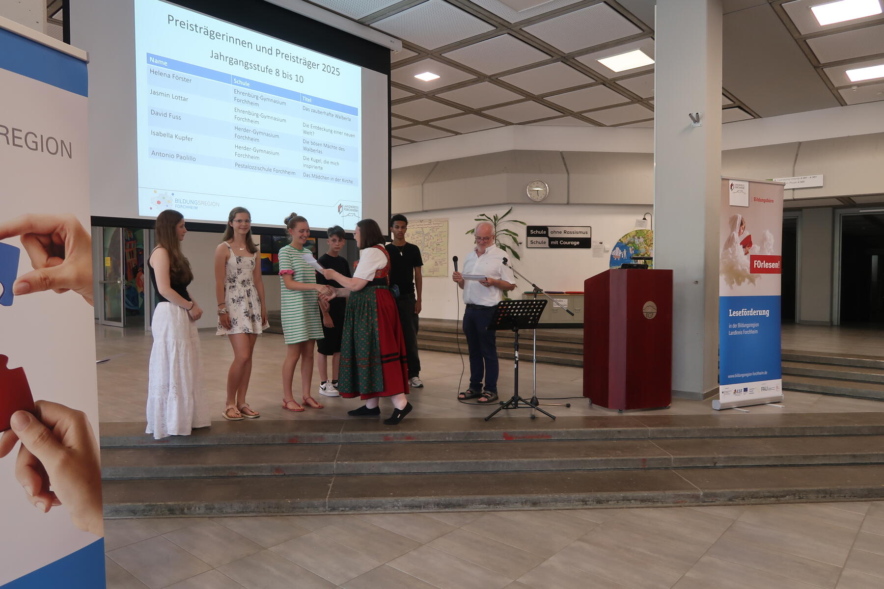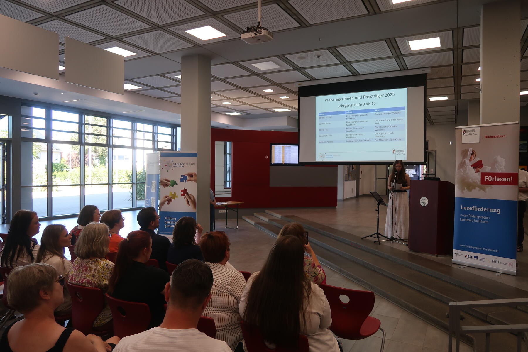 Am 30. Juni 2025 wurden die Siegertexte bei einer Preisverleihung am Ehrenbürg-Gymnasium Forchheim gewürdigt. Die Veranstaltung wurde feierlich durch Susanne Schmidt (Oberstudiendirektorin des Ehrenbürg-Gymnasiums Forchheim) und Dr. Julia Schilling (Leiterin des Bildungsbüros) eröffnet. Dr. Schilling betonte: „Die Förderung von Schreibkompetenzen von Schülerinnen und Schülern ist ein zentrales Anliegen des Wettbewerbs und wir freuen uns sehr, dass auch in diesem Jahr Kinder und Jugendliche des Landkreises ihre sprachlichen Fähigkeiten und ihr kreatives Potenzial in den eingereichten Erzählungen und Gedichten auf beeindruckende Weise zum Ausdruck gebracht haben.“ Anschließend führten Martin Haendl und Karlheinz Schoofs die teilnehmenden Gäste durch die Veranstaltung. Es wurden einzelne Wettbewerbsbeiträge vorgelesen und alle prämierten Schülerinnen und Schüler durften im Beisein ihrer Familien stolz eine Urkunde, einen Buchgutschein und den frisch gedruckten Erzählkugel-Band 2025 mit insgesamt 29 Beiträgen aus unterschiedlichen Jahrgangsstufen und Schularten von Frau Barbara Poneleit (weitere stellvertretende Landrätin) entgegennehmen. Der Band wurde auch in diesem Jahr wieder von einer studentischen Arbeitsgruppe unter Leitung von Dr. Volker Titel (Institut für Buchwissenschaft an der Friedrich-Alexander-Universität Erlangen-Nürnberg) gestaltet.
